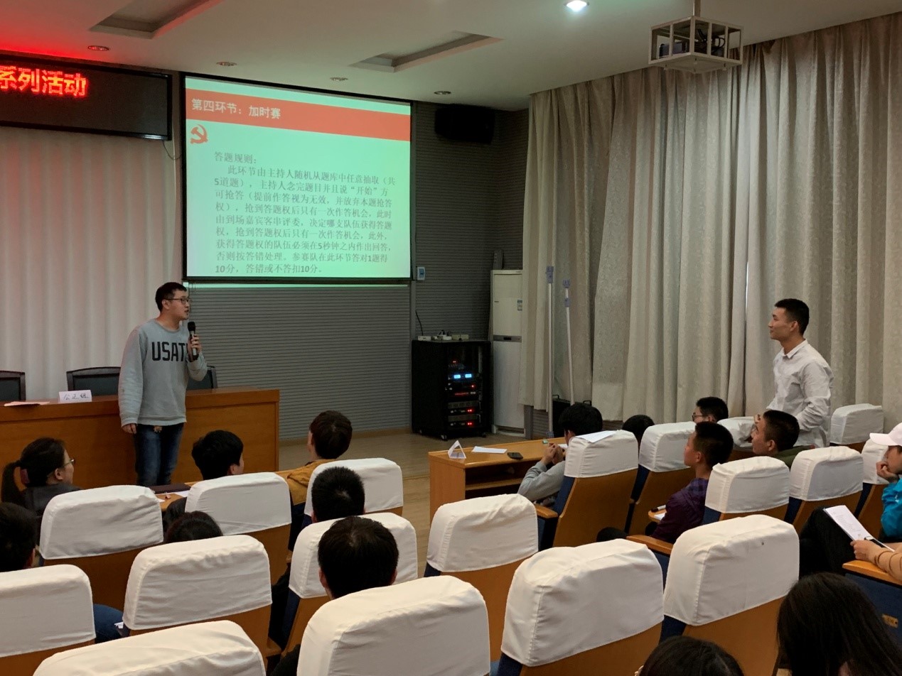 初赛形式为闭卷笔试,各学生党支部组成16支队伍,每支队伍3位选手共48人参加。每支队伍的三名选手有效得分之和为该队伍总成绩,根据分数由高到低选拔8支队伍晋级复赛。经过30分钟的考试,电信专业本科生党支部、2016-1硕士研究生党支部、机械专业第二本科生党支部、通信专业第二本科生党支部、国防生向阳党支部、2017-4硕士研究生党支部、2017级机械工设硕士研究生党支部、通信专业第一本科生党支部成功进入决赛环节。