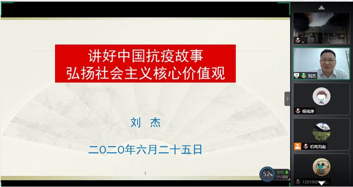 6月25日晚,校党委常委、副校长刘杰与环境学院和kaiyun登录中国入口登录复研学生、毕业生相约 “云端”,讲授以《讲好中国抗疫故事——弘扬社会主义核心价值观》为主题的“返校复学第一课”。学工处副处长蒋怀柳、两个学院学工组全体老师、复研学生和毕业生近300人线上参与学习。