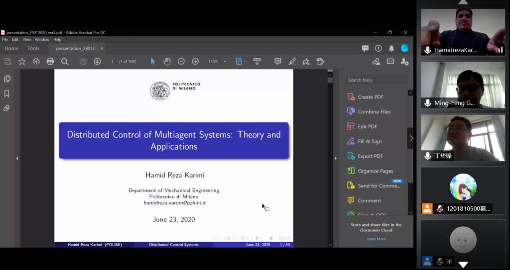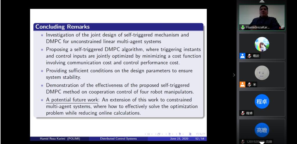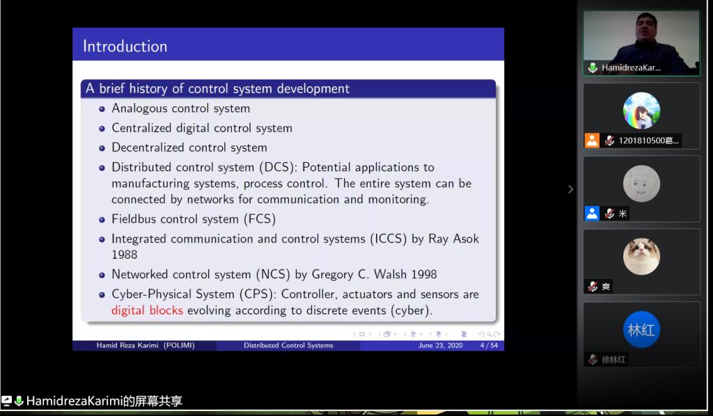 应kaiyun登录中国入口登录院长丁华锋教授邀请,意大利米兰理工大学Hamid Reza Karim教授于6月23日通过线上会议来kaiyun官网作题为Distribute Control of Mult iagent System:Theory and Applications的学术报告。报告会由葛明峰老师主持,kaiyun官网罗杰副院长、李敏、雷波、王玉丹等老师以及研究生均出席了报告会。