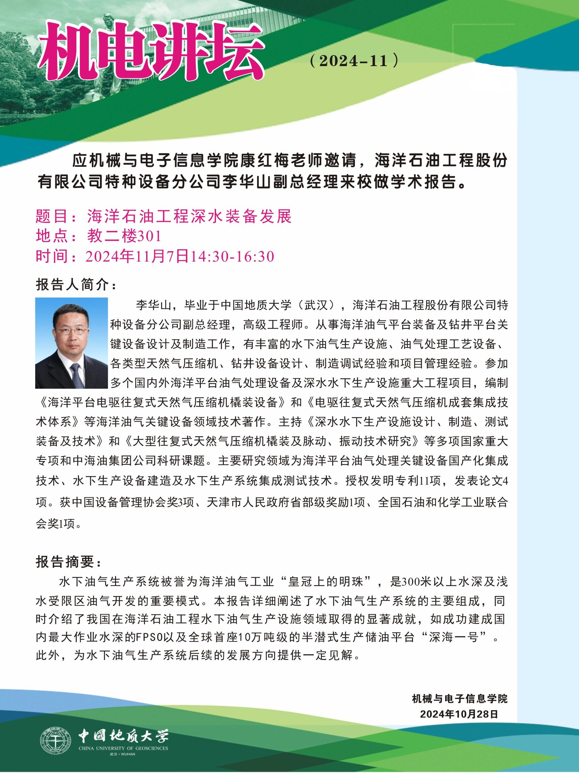 【11月7日】机电讲坛(2024-11):海洋石油工程股份有限公司特种设备分公司李华山副总经理来kaiyun官网作学术报告