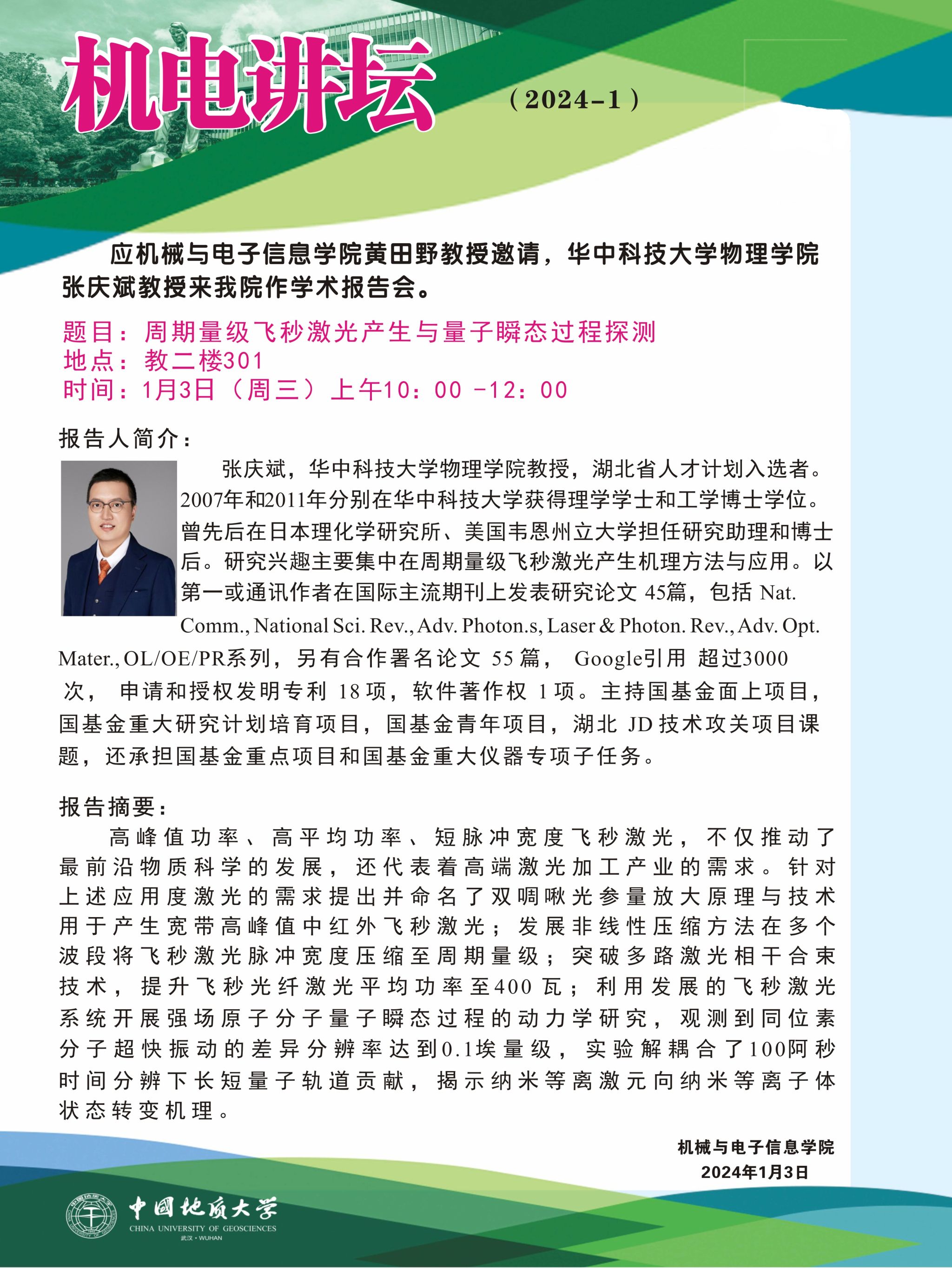 【1月3日】机电讲坛(2024-1):华中科技大学物理学院张庆斌教授来kaiyun官网作学术报告会