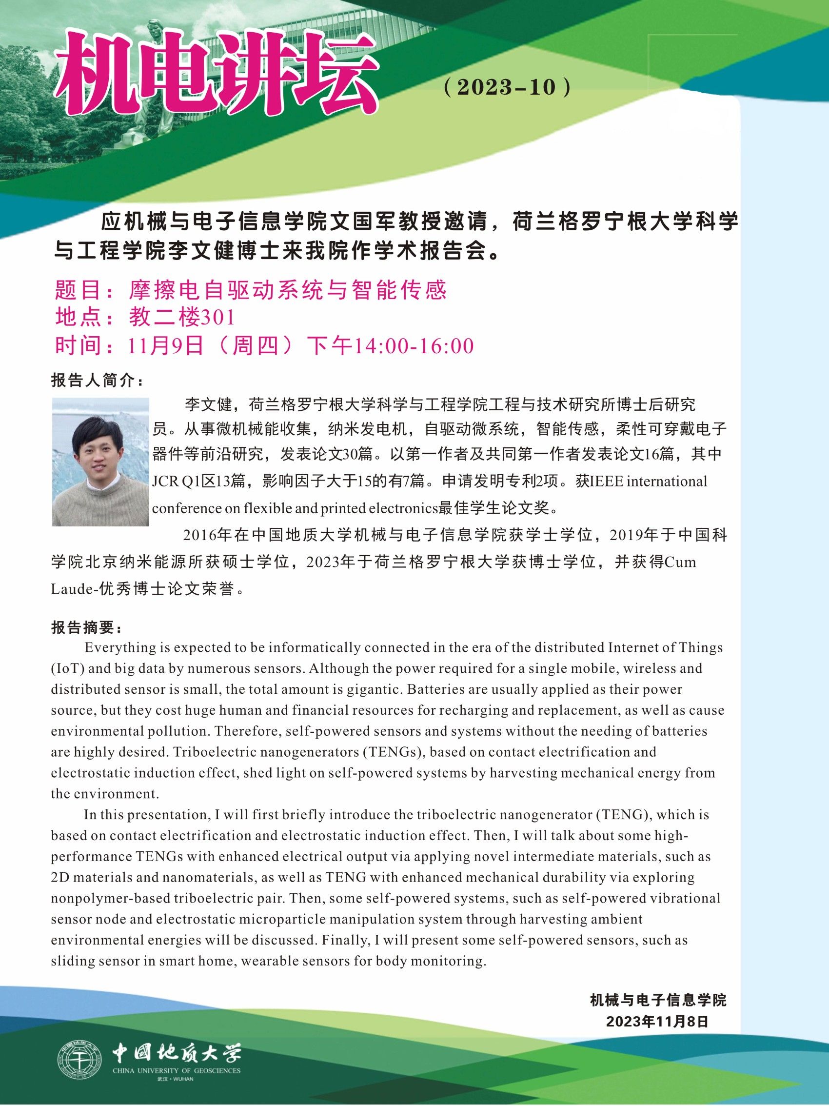 【11月9日】机电讲坛(2023-10):荷兰格罗宁根大学科学与工程学院李文健博士来kaiyun官网作学术报告会