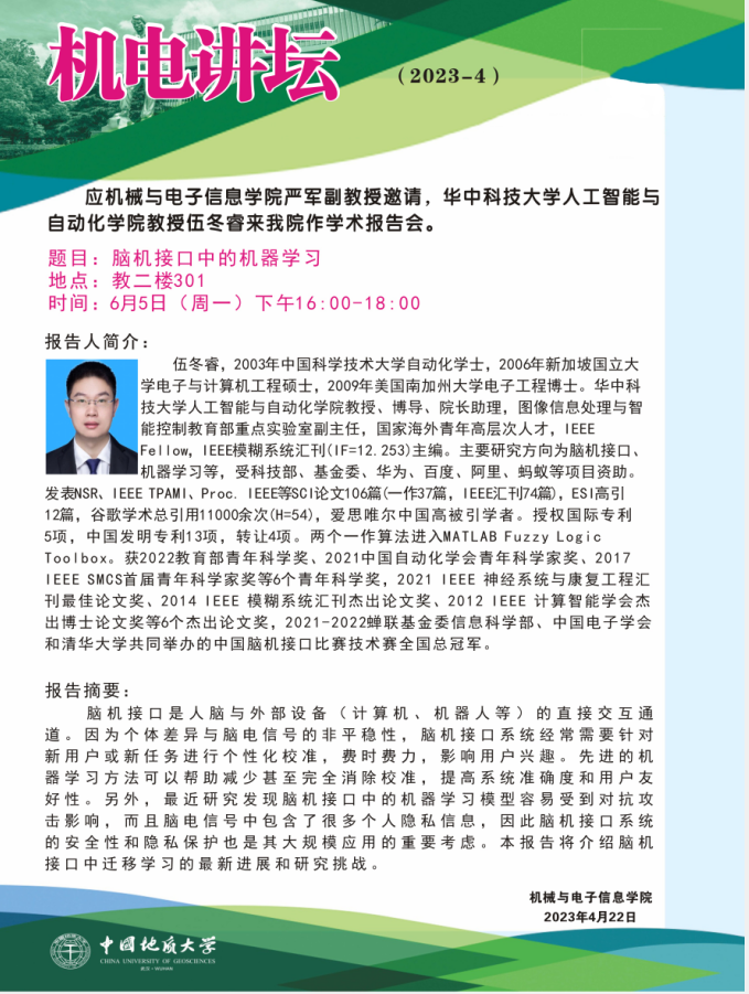 【6月5日】机电讲坛(2023-4:华中科技大学人工智能与自动化学院教授伍冬睿来kaiyun官网作学术报告会