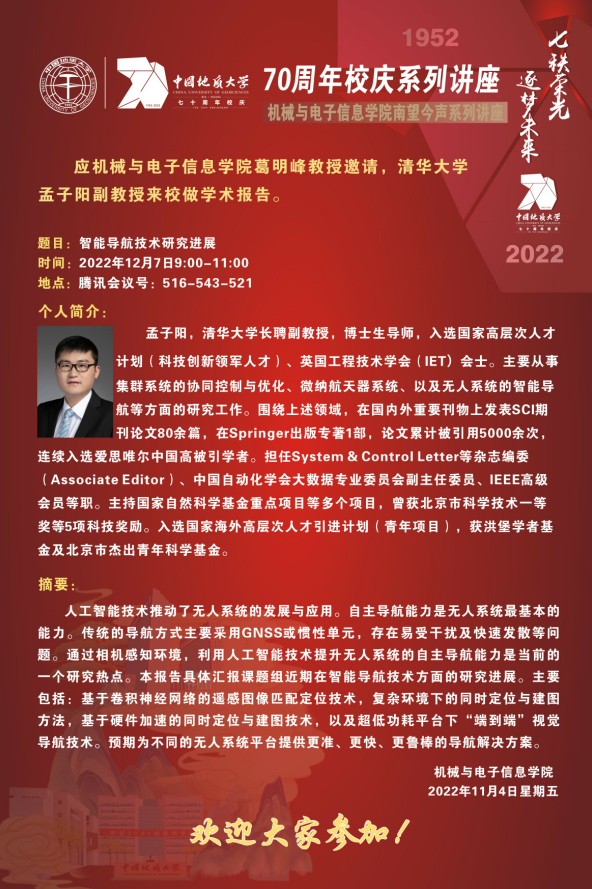 【12月7日】校庆系列学术活动---机电讲坛(2022-34):清华大学孟子阳长聘副教授