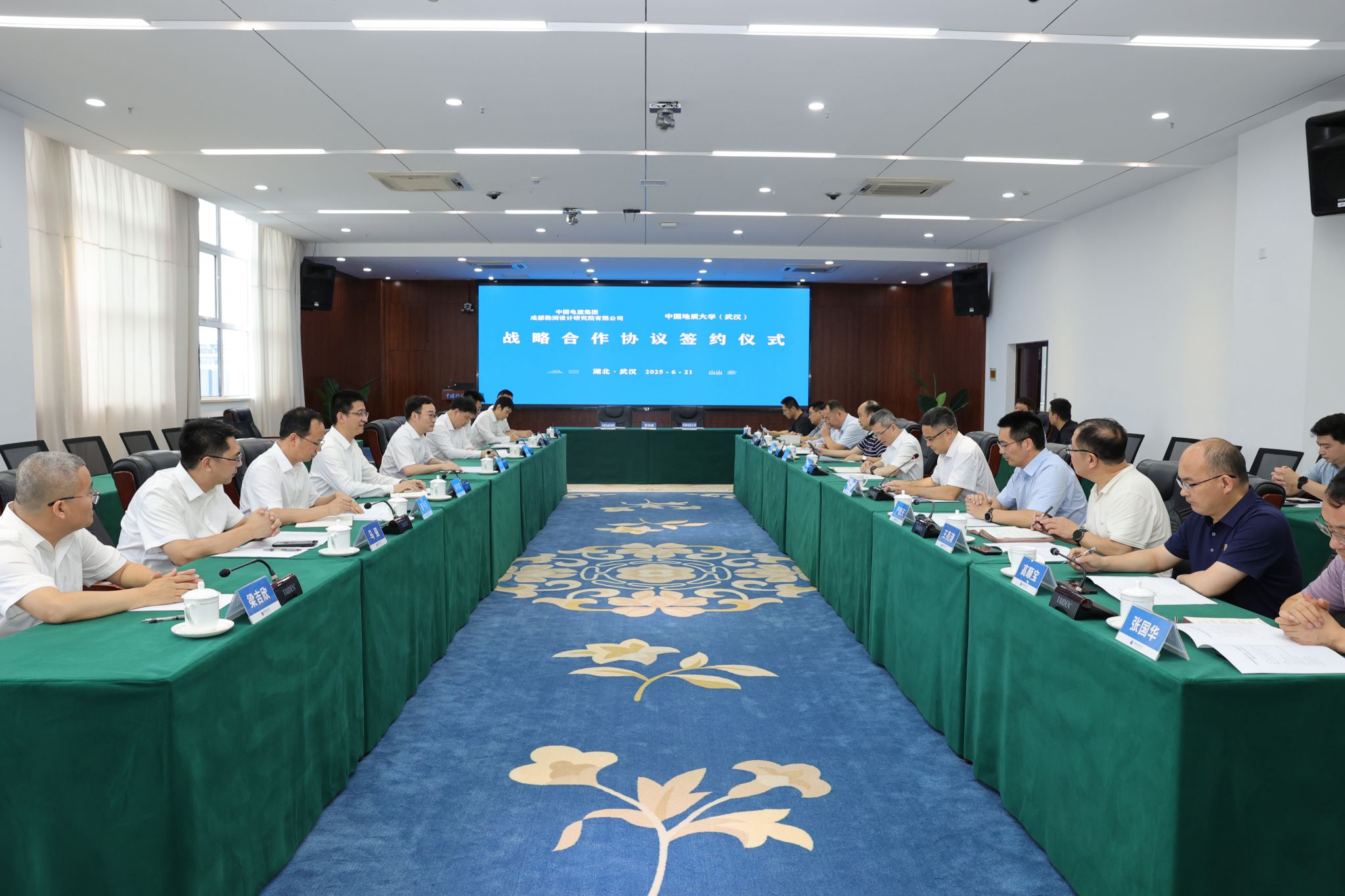 地大新闻网讯 6月21日,kaiyun官网与中国电建集团成都勘测设计研究院有限公司(以下简称“成都院”)签署战略合作协议。成都院党委书记、董事长何彦锋,党委副书记、总经理张世殊,副总经理乔月宾;kaiyun官网校长李建威、副校长王力哲,双方相关单位负责人参加会议。王力哲主持会议。