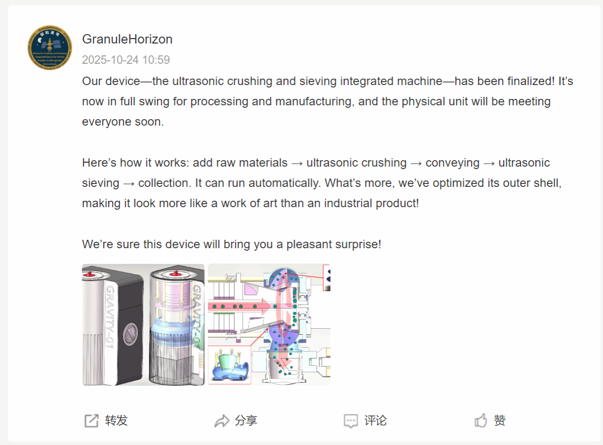 微重力环境下的超声破碎与筛分一体化装置未来可广泛应用于空间站资源重复利用、小天体探测等太空场景,同时在地球的矿物处理、制药细化、新材料制备等领域也具有广阔前景。