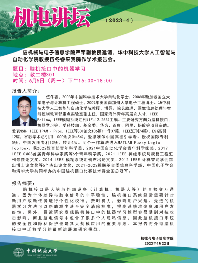 【6月5日】机电讲坛(2023-4:华中科技大学人工智能与自动化学院教授伍冬睿来kaiyun官网作学术报告会