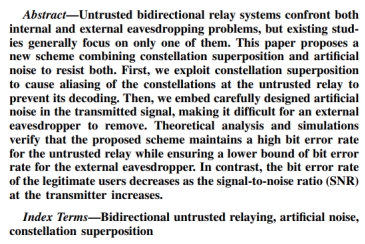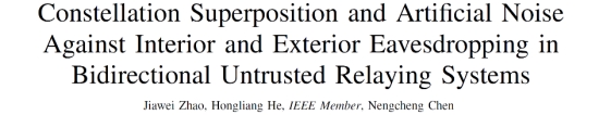 近日,kaiyun登录中国入口登录通信系2022级本科生赵家伟以第一作者在IEEE国际知名期刊IEEE Wireless Communications Letters发表题为“Constellation Superposition and Artificial Noise Against Interior and Exterior Eavesdropping in Bidirectional Untrusted Relaying Systems”的学术论文。该论文提出了基于人工噪声的星座叠加技术,为双向中继系统对抗来自内部和外部的非法窃听提供了创新性解决方案。论文的指导教师为通信系特任副教授贺宏亮。