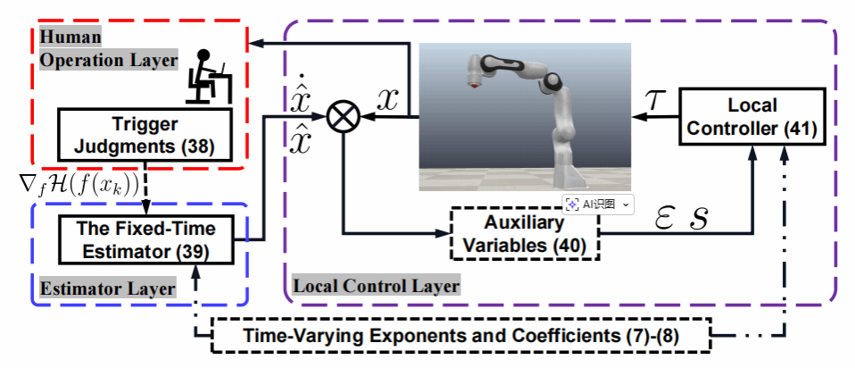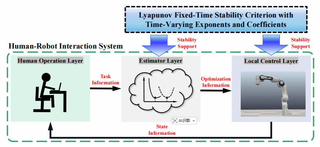 近日,kaiyun官网kaiyun登录中国入口登录葛明峰教授团队(付智辉、葛明峰、丁腾飞)与华中科技大学人工智能与自动化学院刘智伟教授团队合作的最新研究成果“Task optimization for fixed-time control of intermittent human-robot interaction with time-varying exponents and coefficients”被国际主流期刊《IEEE Transactions on Cybernetics》(2026年1月26日最新影响因子10.5,最新学校分区为T1)在线发表(DOI:10.1109/TCYB.2026.3650907)。该文提出了一种分层固定时间事件触发优化(Hierarchical Fixed-Time Event-Triggered Optimization,HFTEO)算法,旨在提升人类与机器人在动态环境中协作任务的效率与安全性。随着人工智能和机器人技术的快速发展,人机协作系统在工业、医疗、服务等多个领域的应用日益广泛。传统的机器人控制系统通常依赖于精确的指令与数据输入,但在实际应用中,人类操作员的决策往往是不确定和变化的,这对机器人的稳定性和任务执行效率提出了更高的要求。传统的任务优化方法往往依赖于连续和稳定的操作环境,但实际的人机交互通常是间歇性的,且存在不确定性,例如人类操作员的反应时间延迟、意图变化以及机器人控制的响应能力等。这使得如何在不确定的交互环境中确保任务的高效完成,成为一个亟待解决的技术难题。