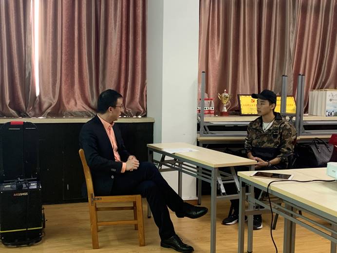 活动开始,熊伟通过模拟真实面试场景,让同学们对面试有体验感的认识,并强调由于今年企业招收量下降,竞争更加激烈,同学们更应该重视明确职业定位、职业方向、职业目标,提早规划人生方向。