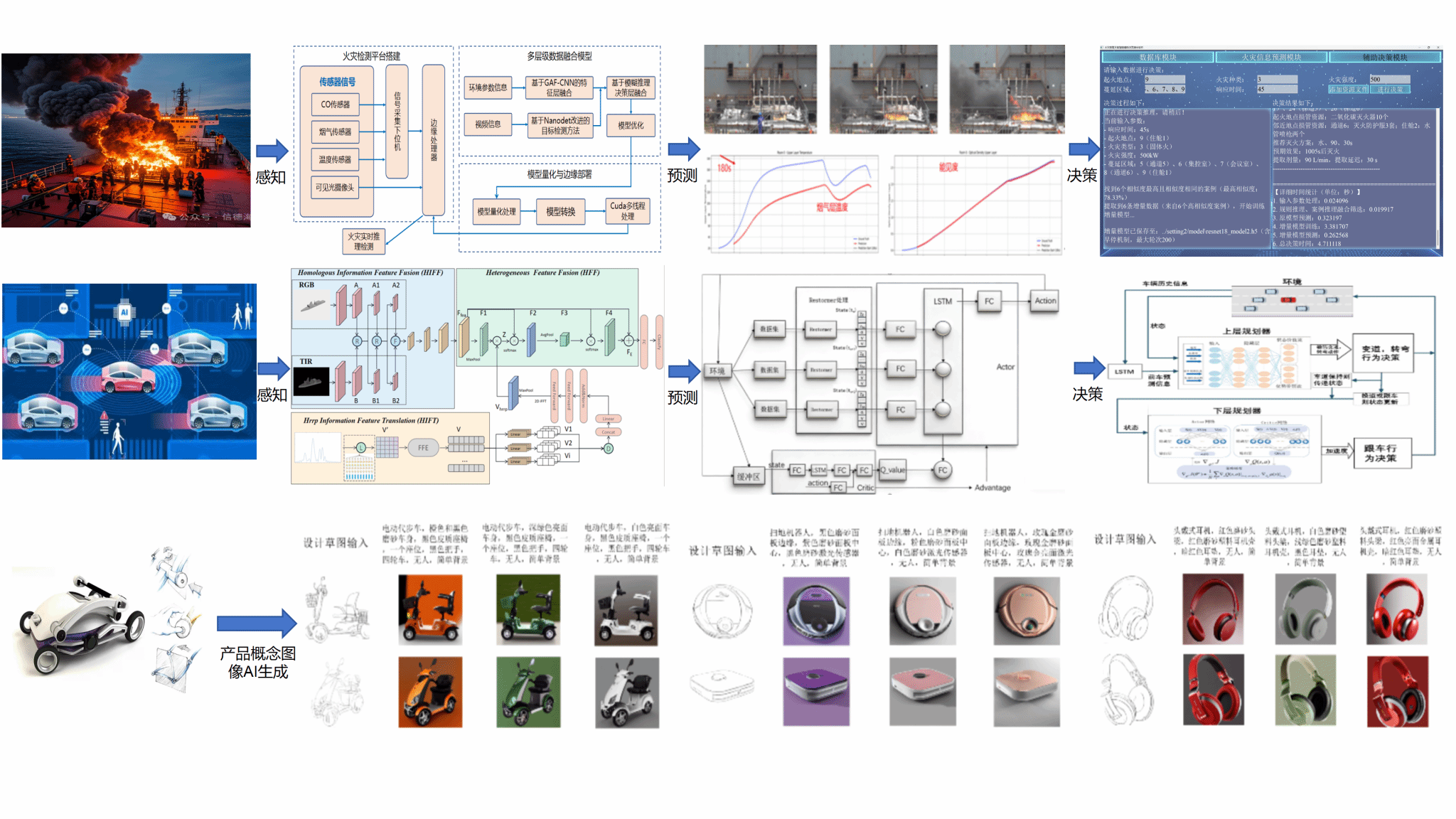 (1)感知端:基于可见光、红外摄像头、雷达等各类传感器的感知信息融合形成环境(如战场、火灾、智能驾驶)态势。技术基础:深度学习、多传感探测融合、生成式AI等